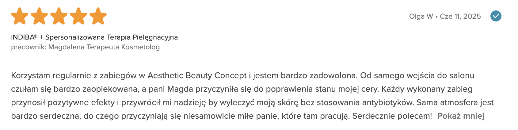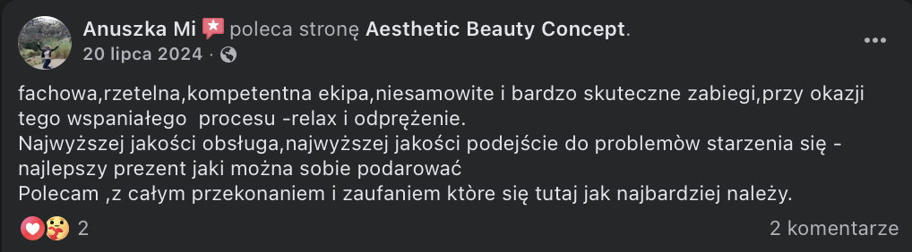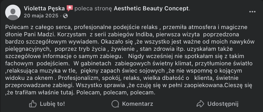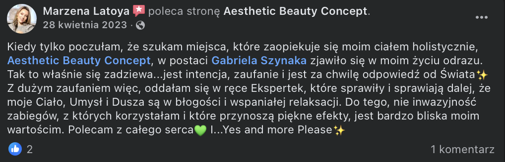 To prawdziwy wulkan pozytywnej energii – uśmiechnięta, otwarta i zaangażowana, a jednocześnie niezwykle uważna i wsłuchana w potrzeby osób, z którymi pracuje. Tworzy atmosferę zaufania i komfortu, dzięki czemu każda wizyta staje się nie tylko zabiegiem, ale także chwilą zadbania o siebie.